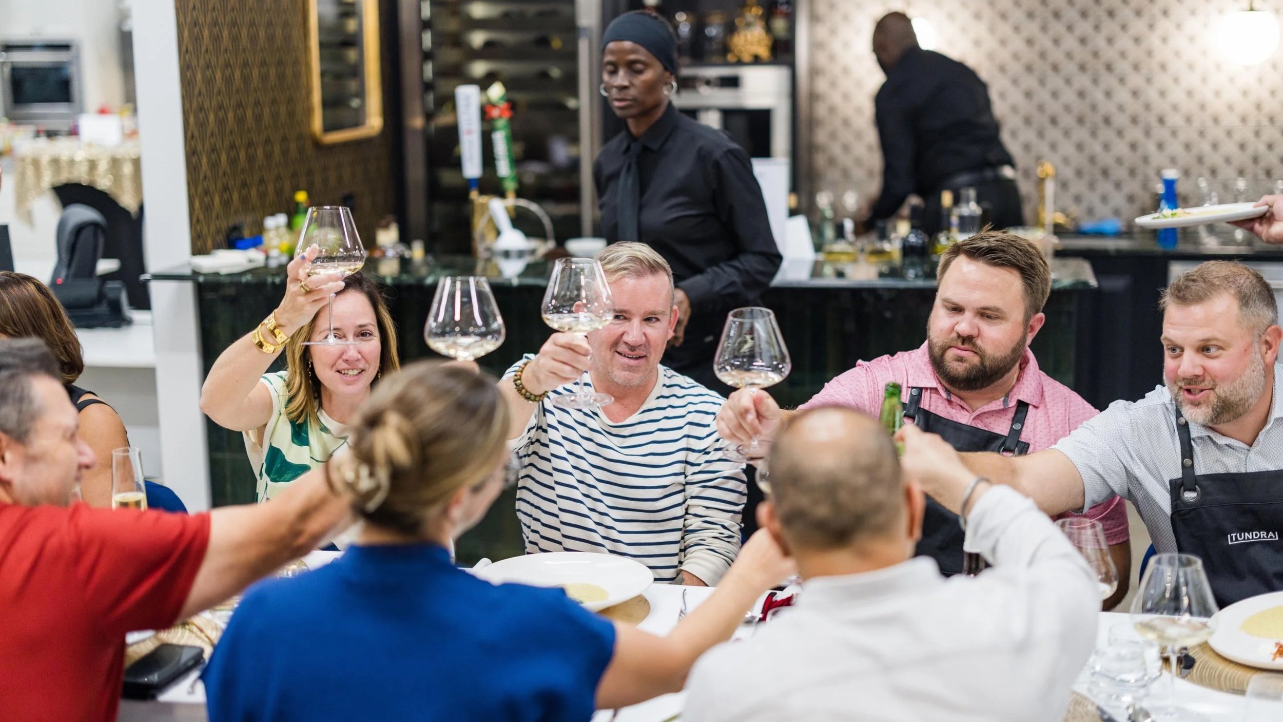 The competition ends at the table. Your team sits down together and eats what they made — with wine, great conversation, and the energy of a day that was worth showing up for.