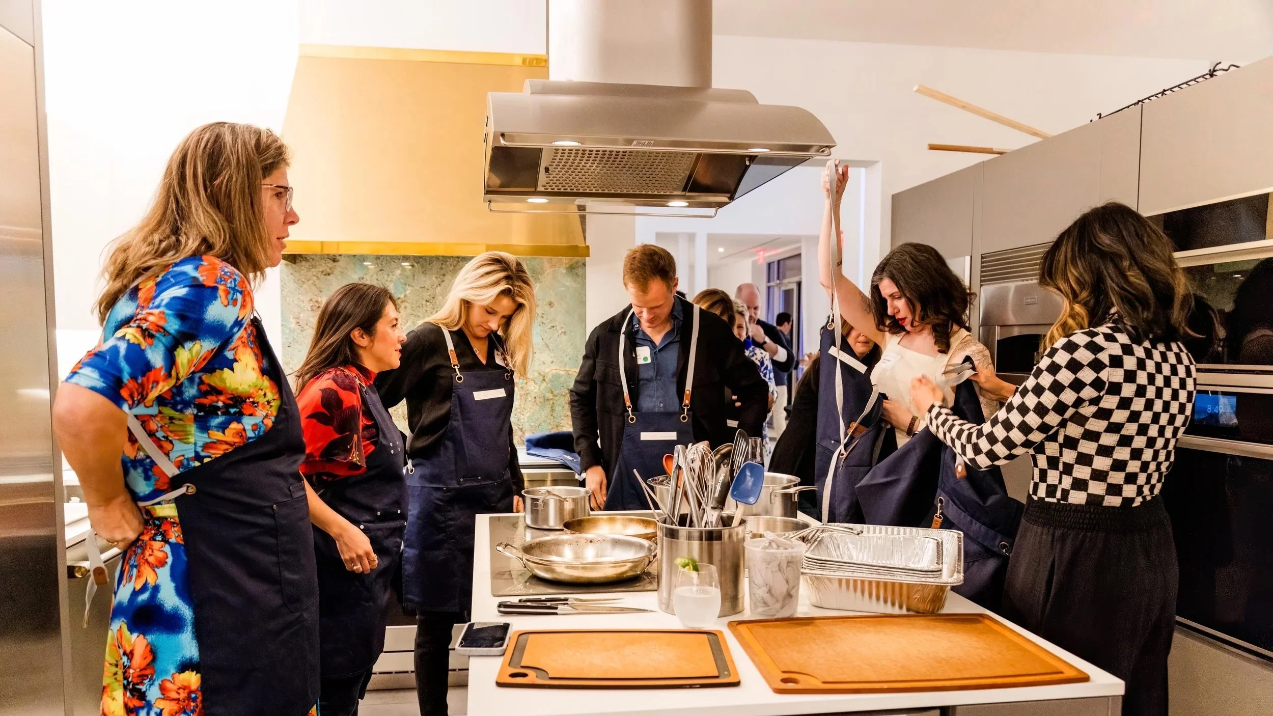 Charcuterie and small plates for arrival | Custom chef aprons with company branding | Gifts and prizes for the winning team | Photography | Entertainment | Brand activations | Transportation coordination | Exotic and premium ingredients