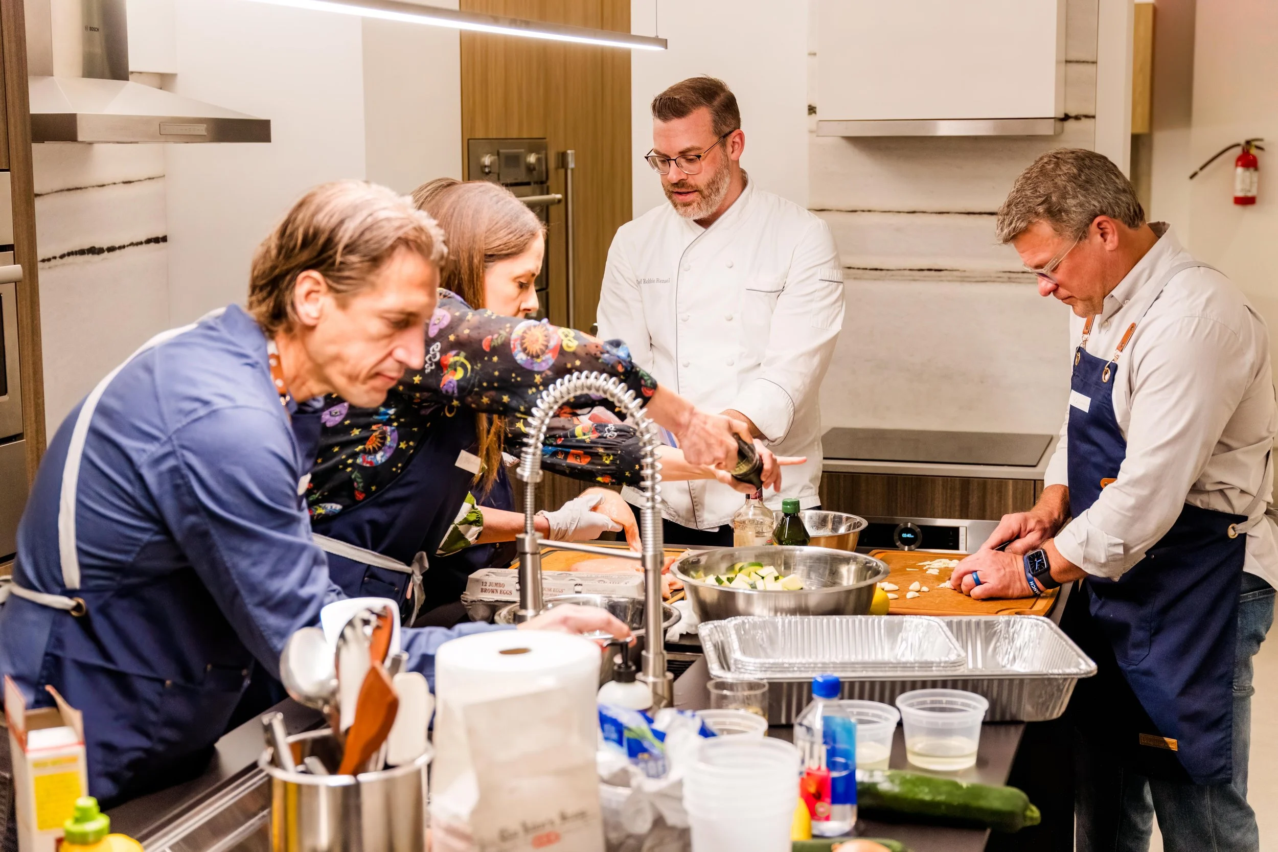 Not a recipe demonstration. A real culinary education led by a CIA-trained chef in seven fully equipped residential kitchen stations in River Oaks, Houston.